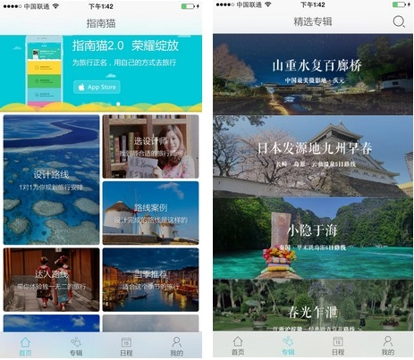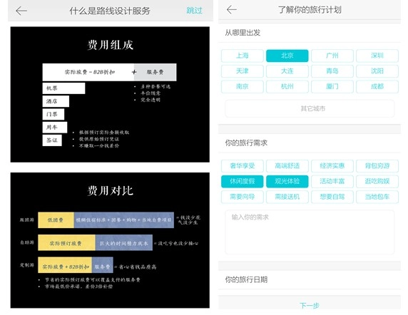 打开指南猫的,美丽的风景先于其他映入眼帘,很容易勾起在城市奔波的人们对于阳光海风的渴望。围绕着定制旅行而展开的功能模块划分清晰又紧扣主题,在选择设计师设计路线之前,你可以先浏览一些路线案例。即使你没有强烈的定制需求,贴心的达人路线和当季推荐功能也不会让你空手而归。比起其他只希望用户立即产生购买行为的产品,指南猫做的很恰到好处,“我们推荐定制,但不强制你选择。”