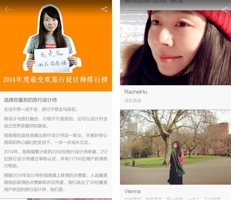 在浏览过指南猫上的设计师评选界面之后,你会发现设计师们不仅经验丰富,颜值也是爆表水准。难道颜值也是评选标准吗?在这个看脸的时代,你懂得,就当是送给用户的彩蛋吧!