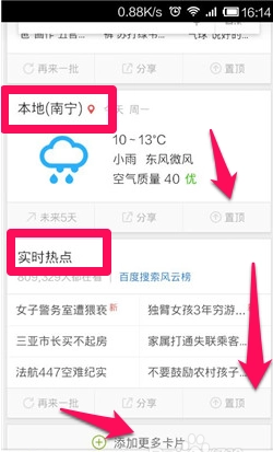 2.下拉一点,天气预约和实时热点,点击件箭头指示的置顶即可更换位置,再点击下面的“添加更多卡片”就可以选择添加更多内容到这里了。