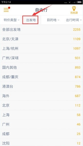 3、点击出发地,即可了解所有选择出发地的特价信息,用户可以根据自己选择的出发地来选择旅游线路哦。