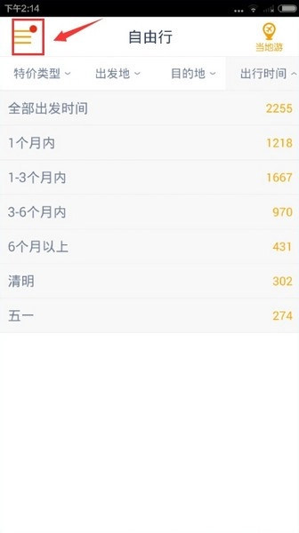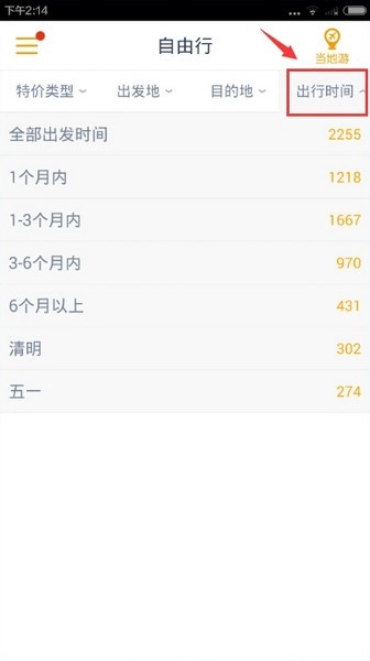5、点击出行时间,用户即可以根据出行的时间选择旅游线路,而且特别是节假日想旅游时,就为你提供全程的服务哦。