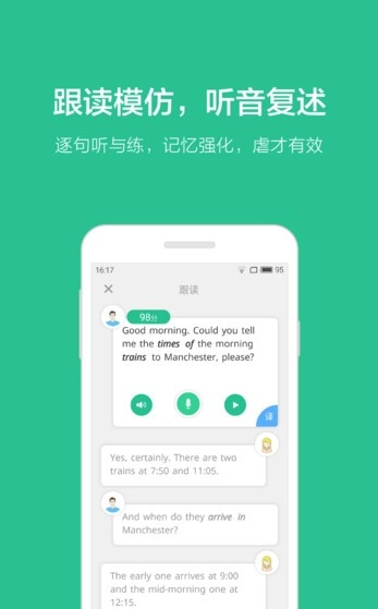 不止于说英语口语、单词、语法和听力全面提升是扇贝口语的独到之处。拒绝单一跟读模式。提前预习重点词汇,事半功倍。跟读模仿阶段智能打分,纠正发音错误。提供逐句中文翻译。听音复述,不给文本,完全凭借记忆(对,就是要虐)。还可以将你的发音分享给朋友,学习路上不孤单。