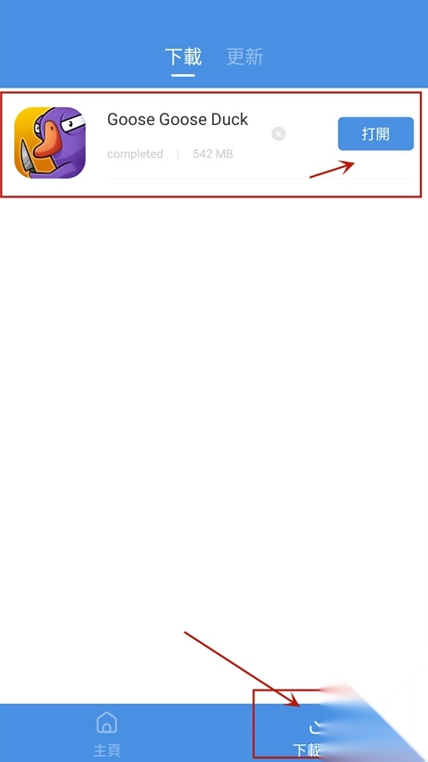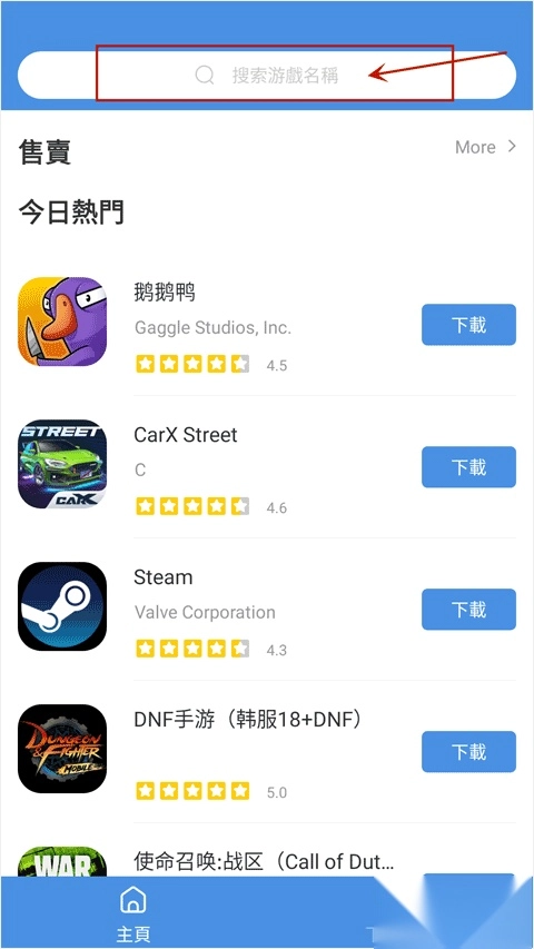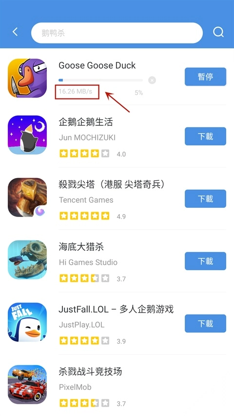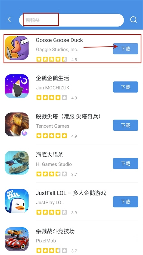这里就拿近期走红的鹅鸭杀游戏来举例,在顶部搜索框输入“鹅鸭杀”,就能在下方看到这款游戏的评分和厂商信息,点击一键操作即可完成;