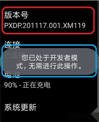 我们先打开手表,依次进入“设置”“系统”“关于”页面,找到“版本号”这一选项后,连续点击它至少7次,直至页面提示开发者模式已开启即可。