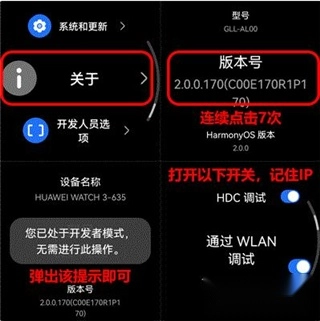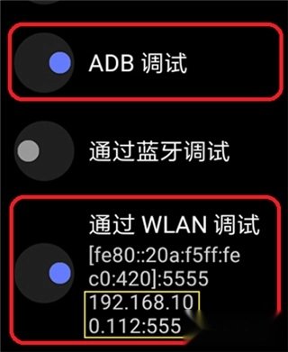 找到“ADB调试”与“通过WLAN调试”这两个选项并开启,之后保持在当前界面,下方黄圈标注的数字后续会用到。