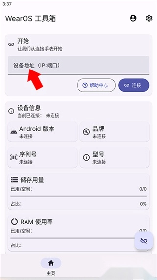 接下来安装wearos工具箱软件,确保两台设备处于同一wifi网络环境中,然后在软件首页输入“通过WLAN调试”下方显示的ip地址和端口,即可完成连接。