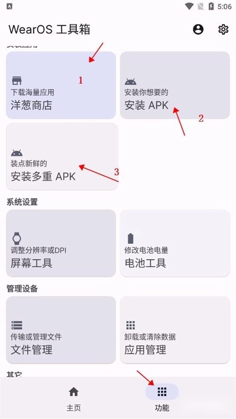 使用工具箱连接手表后,点击功能栏,其中第一个选项为洋葱商店,第二个是安装本地apk,第三个则是多重apk。