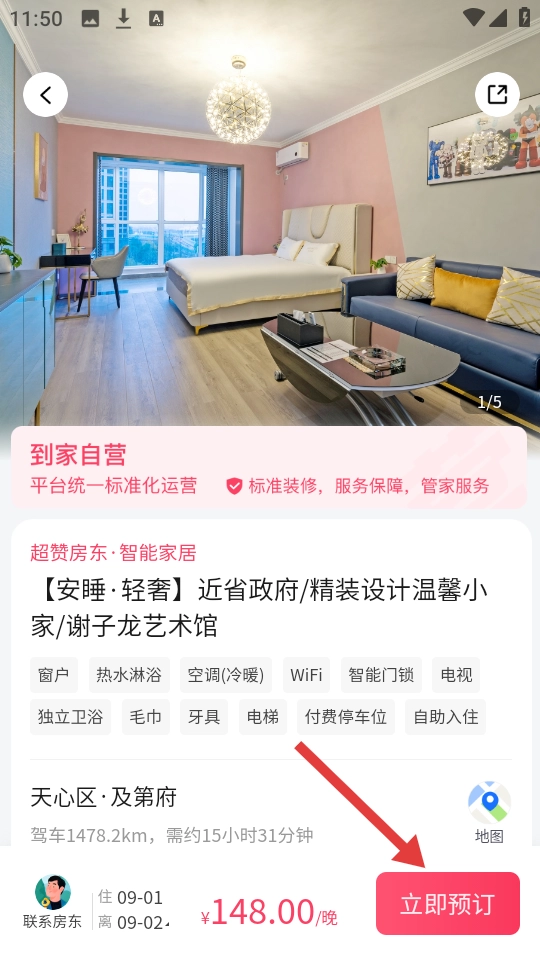 3、进入心仪房源的详情页面,查看设施配备、具体位置等信息,确认无误后点击【立即预订】按钮,即可完成住宿的预订流程。