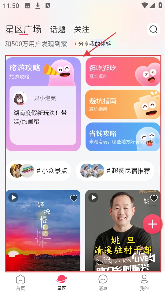 4、打开“星区广场”页面后,能够浏览【旅游攻略】【逛吃逛吃】等板块,从中获取旅游、美食等相关信息,并且可以分享自己的体验。