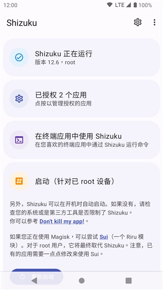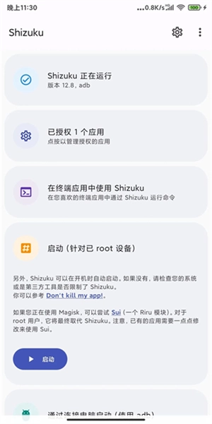 3、Shizuku还提供了通过连接电脑启动(ADB)、通过无线调试启动、以及ROOT启动三种方式,以通过ADB权限进行解决像是冻结应用等功能,让用户更好地管理他们设备上的应用程序,从而提高他们的工作和生活效率。