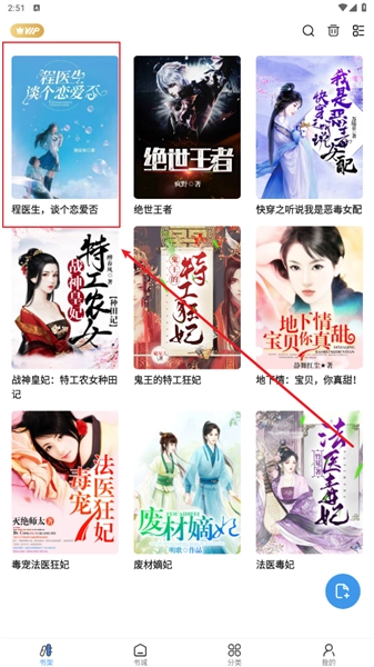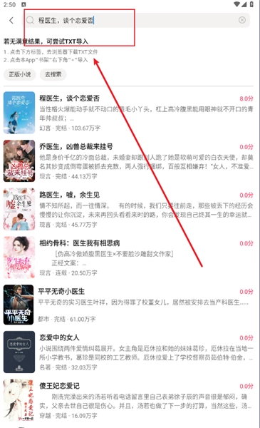 1、打开搜索框搜索你喜欢的书名或作者,比如"程医生,谈个恋爱否"。